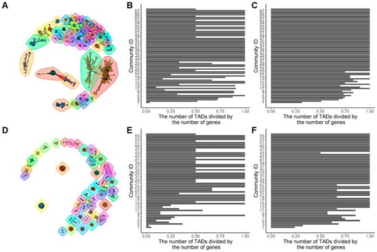 In Figure 4A, 793 genes were clustered into 68 communities. Figure 4B shows the same-TAD-belonging ratios of all of the communities sorted by the number of genes in each community from high to low. For example, community 1 has 286 genes, and community 68 has only two genes. Figure 4C also shows the same-TAD-belonging ratios, but the genes in each community were randomly selected from the FSN. In other words, the same number of genes were randomly selected for each of the communities. The Wilcoxon test p-values for the distributions in Figure 4B,C is 0.01, and it is 3.8 × 10−4 for the distributions in Figure 4E,F. These p-values indicate the statistical significance of the same-TAD-belonging ratios compared to the randomly formed communities.