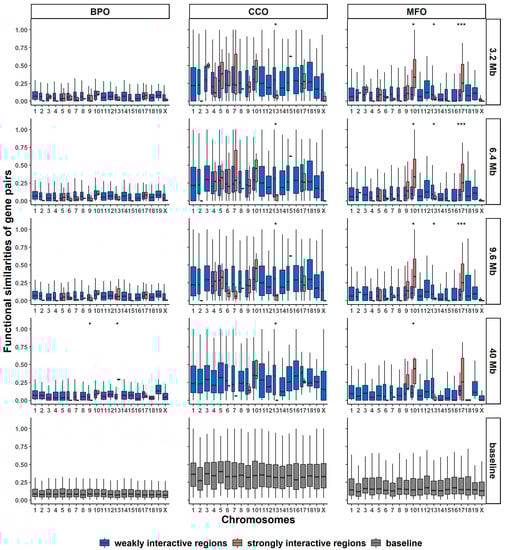 Boxplots of functional similarities of gene pairs from long-range interactive regions in BPO, CCO, and MFO. Different rows represent that the boxplots were generated at different genomic-distance thresholds: 3.2 Mbp, 6.4 Mbp, 9.6 Mbp, 40 Mbp, and baseline. The baseline gene pairs were randomly selected regardless of weakly or strongly interactive regions. *** indicates that the p-value of the Wilcoxon test is less than 0.0001, and * indicates that the p-value is between 0.001 and 0.05.