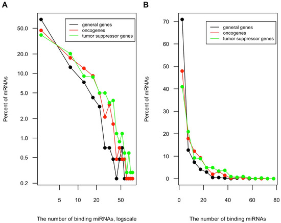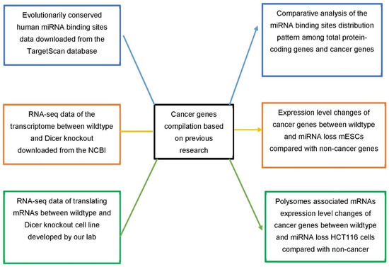 However, one overall observed trend is the widespread downregulation of miRNAs, generally considered a hallmark of human cancer [26]. Moreover, the development of next-generation sequencing (NGS) has accumulated massive amounts of sequencing data, which made it possible to analyze the interaction between cancer genes and miRNAs on a genome-wide scale. Thus, in this study, instead of focusing on individual miRNA–mRNA relationships, we performed an overall comparison of protein-coding genes, oncogenes, and TSGs. We utilized available miRNA target prediction resources and global gene expression data upon genetic disruption of miRNA production. We also assembled a group of well-constructed human cancer genes. Subsequently, we were able to investigate whether oncogenes or TSGs are more miRNA targeted—a major question complementing the overall downregulation of miRNA in cancer. Thus, the analysis fills a gap in the roles of miRNA in cancer.