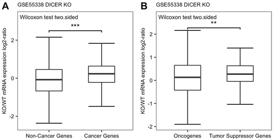 (A) Average expression changes of total protein-coding genes and 733 cancer genes in Dicer knockout mESCs (p-value < 2.2 × 10−16 by two-sided Wilcoxon rank-sum test). (B) Average expression changes of 409 oncogenes and 324 TSGs in Dicer knockout mESCs (p-value = 0.0094 by two-sided Wilcoxon rank-sum test). (“**” indicates p < 0.01, “***” indicates p < 0.001).