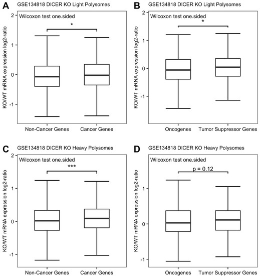 (A) Average light polysomes associated mRNA expression changes of total protein-coding genes and 828 cancer genes in Dicer1 knockout human HCT116 cells (p-value = 0.015 by one-sided Wilcoxon rank-sum test). (B) Average light polysomes associated mRNA expression changes of 413 oncogenes and 415 TSGs in Dicer1 knockout human HCT116 cells (p-value = 0.032 by one-sided Wilcoxon rank-sum test). (C) Average heavy polysomes associated mRNA expression changes of total protein-coding genes and 828 cancer genes in Dicer1 knockout human HCT116 cells (p-value = 0.00086 by one-sided Wilcoxon rank-sum test). (D) Average heavy polysomes associated mRNA expression changes of 413 oncogenes and 415 TSGs in Dicer1 knockout human HCT116 cells (p-value = 0.12 by one-sided Wilcoxon rank-sum test). (“*” indicates p < 0.05, “***” indicates p < 0.001).