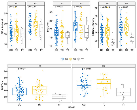 - In the whole sample (HC+BD), BDNF Met/Met homozygosis (but not Val/Met heterozygosis) was associated with lower BIS scores when compared to the wild-type genotype (Val/Val).