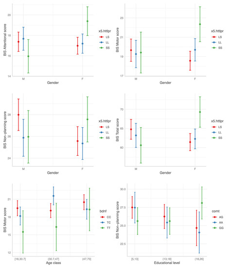 Of note, no significant interaction effect on impulsivity levels was evident between disease status (HC vs. BD) and any polymorphism status, apparently implying no differences in the modulatory effect of the three SNPs on impulsivity between HC and BD individuals. The most consistent interaction found was that between the 5-HTTLPR SS genotype status and gender. In females the SS homozygosis was associated with higher BIS scores across all the three BIS factors when compared to the LS heterozygosis (Figure 4). Of note, no main effect of the SS genotype was evident. Two other significant interactions were found: higher Motor BIS score for the combination BDNF TC and age class (31.7–47) and elevated BIS Non-Planning scores for high education levels with GG genotype in COMT. However, in both cases the effect was limited to only one BIS factor and did not influence Total BIS scores (Figure 4; Table 3).