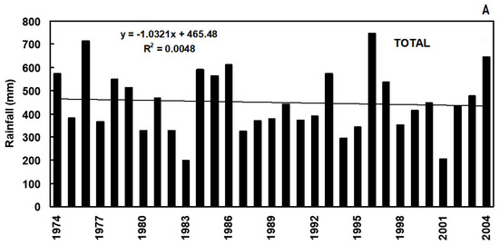 Trends in mean annual temperature (Tmean) (°C) along with Standardized Anomaly Index (SAI) values, and annual and seasonal amounts of rainfall (mm) observed in the study area over the period 1974 to 2004, are shown in Figure 1 and Figure 2, respectively. The Tmean linear trend shows an increase of 0.44 ± 0.59 °C per decade (Figure 1A). Lower than average temperatures are prevalently scattered over the left-hand side of the SAI graph (approximately from 1974 to 1985), i.e., in the first years of the study period, whereas in the following years higher than average temperatures become more frequent (Figure 1B). A non-significant negative trend for annual and seasonal rainfall amounts was observed except in autumn, which showed a non-significant increasing trend (Figure 2A,B). This seasonal downward trend is clearer in winter than in spring and summer.
