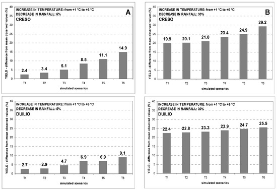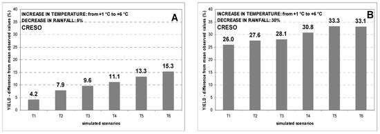 A similar trend was observed for Simeto with a decrease of grain yield ranging from 6.7% (scenario T1_R5) to 11.2% (scenario T6_R5) for a 5% rainfall reduction (Figure 5A), and from 27.8% (scenario T2_R30) to 30.1% (scenario T6_R30) for a 30% rainfall reduction (Figure 5B).
