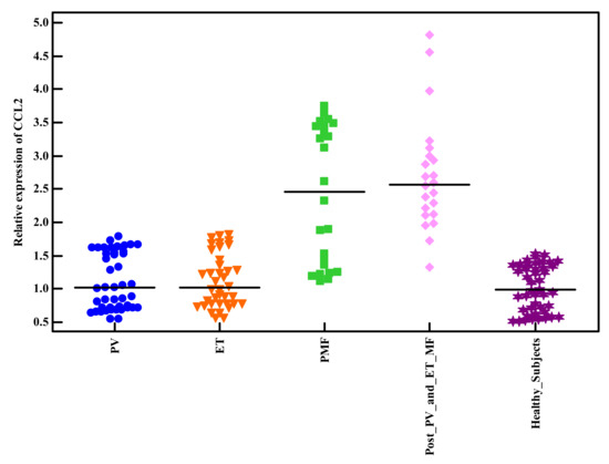 Relative expression of CCL2 among Philadelphia-negative MPNs patients and healthy subjects.