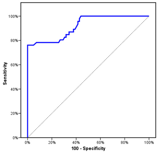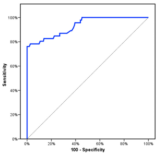 ROC curve for relative expression of CCL2 to discriminate MF patients (PMF and Post-PV/ET-MF) (n = 46) from PV and ET (n = 82).