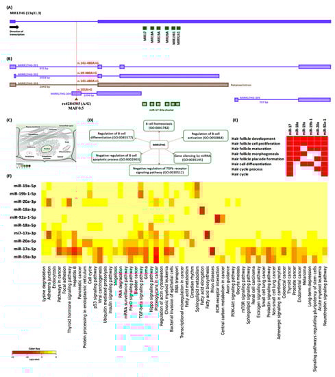 Structural and functional analysis of the MIR17HG cluster region. (A) Genomic context of the MIR17 host gene. The MIR17HG cluster gene is located at chromosome 13q31.3 at the forward strand. The genomic sequence enclosed six microRNAs with the following order: miR-17, 18A, 19A, 20A, 19B1, and 92A1. (B) MIR17HG transcripts and polymorphism. The gene encodes four lncRNAs and one retained intron transcript by alternative splicing, but only the longest (MIR17HG-202) is a polycistronic transcript containing the miR-17-92a-1 cluster. A common variant, rs4284505, caused by A with G substitution with a minor allele frequency of 0.5 was analyzed in the study. It was overlapped with four MIR17HG transcripts: within the first intron of three of them (480 bases upstream to the start of the second exon) and as a non-coding exon SNP in another one at nucleotide number 101 out of 1096 of the first exon. (C) Subcellular localization of MIR17HG within the nucleus and extracellular matrix. The color code indicates the confidence level of abundance (D) gene ontology analysis of MIR17HG. (E) Six microRNA cluster is involved in hair follicle-related biological processes. (F) Functional enrichment KEGG pathway analysis for the six microRNAs within the MIR17HG cluster. [Data source: (www.ensembl.org), (http://diana.imis.athena-innovation.gr/), and (www.GeneCards.org) (all web sites are last accessed on 25 August 2021)].