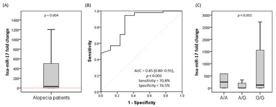 The relative expression levels of serum miR-17 in patients and controls. (A) Fold change in the alopecia patients compared to controls. Values are represented as the medians. The box defines the upper and lower quartiles (25% and 75%, respectively), and the error bars indicate the upper and lower adjacent limits. The red dotted line indicated the control group’s expression level. The Mann–Whitney U test was used. (B) Receiver Operator Characteristics curve for differentiating between patients and the control. The model was significant (p < 0.001). (C) Comparing patients’ expression levels with different genotypes. The Kruskal–Wallis test was used. Pairwise comparisons were adjusted by the Bonferroni correction for multiple testing.