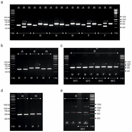 PCR products obtained for male (M) and female (F) individuals of Eudromia elegans (a), Crypturellus tataupa (b,c), and Tinamus solitarius (d,e) species using CHD1iA (iA), CHD1i9 (i9), and NIPBLi16 (iN) markers. The amplicons were resolved in 1% agarose gel. Arrows and numbers correspond to the location and size (in bp) of the DNA molecular marker (1 kb) run on the same gel. In the case of the CHD1i9 marker, annealing temperatures other than 51 °C are marked appropriately if they were used. Asterisks, red and blue dots indicate additional bands detected only in females.