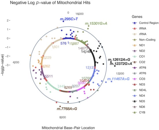 - McRae, A.F.; Byrne, E.M.; Zhao, Z.Z.; Montgomery, G.W.; Visscher, P.M. Power and SNP tagging in whole mitochondrial genome association studies. Genome Res. 2008, 18, 911–917. [Google Scholar] [CrossRef] [PubMed][Green Version]