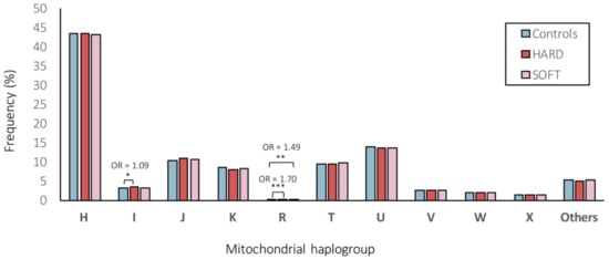 Frequencies (%) of mitochondrial (MT) haplogroups within HARD and SOFT CAD phenotypes vs. controls. ***, ** and * represent statistically significant (of p < 0.001, p < 0.01 and p < 0.05, respectively) differences between the comparison groups.
