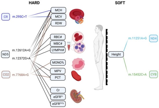 A visual overview of the previous findings for HARD and SOFT CAD MT-SNV associations in UK Biobank reported by ref. []. Created with BioRender.com, accessed on 22 February 2022. MCH: mean corpuscular hemoglobin; MCV: mean corpuscular volume; RDW: red blood cell distribution width; RBC#: red blood cell count; WBC#: white blood cell count; LYMPH#: lymphocyte count; MONO%: monocyte percentage of white cells; MCV: mean corpuscular volume; PCT: plateletcrit; Cr: creatinine; eGFRCr: estimated glomerular filtration rate creatinine; eGFRCrCy: estimated glomerular filtration rate creatinine and cystatin C.