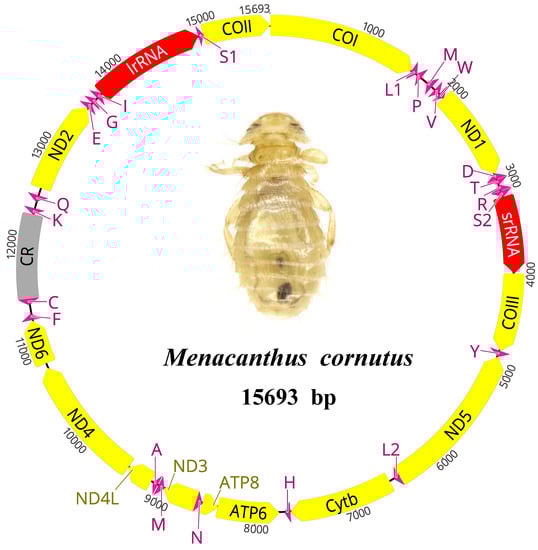 The complete mt genome of Menacanthus cornutus is a single circular chromosome that is 15,693 bp in size, including 38 coding genes (13 PCGs, 23 tRNA genes, and 2 rRNA genes) and a CR (Figure 1, Table S1). In total, 12 genes were transcribed from the minority strand (N-strand) while the other 26 genes were encoded on the majority strand (J-strand). Six gene overlaps were observed, ranging from 1 to 7 bp in length, and the longest occurred between ATP6 and ATP8, which was common among the mt genomes of insects [4]. The CR was located between trnC and trnK, with a size of 871 bp. Apart from the CR, we also identified 23 non-coding regions (NCRs) comprising a total of 582 bp, with the longest being 88 bp between trnC and trnF.