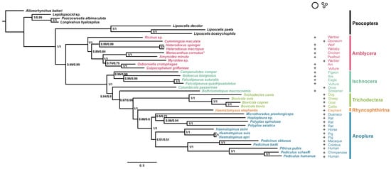 3.2. Phylogenetic Analyses of the Suborder Amblycera and Other Parasitic Lice