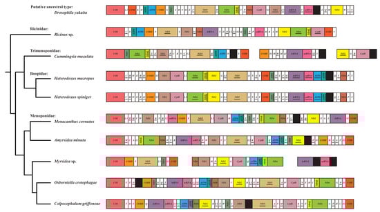 The mitochondrion is an organelle with independent genetic material that is closely related to cellular energy metabolism and acts as a power bank in the life activities of eukaryotes [1,2,3]. Characterized by its stable gene composition, conserved gene order, maternal inheritance, and fast evolutionary rate [2,4], the mitochondrial (mt) genome has been extensively applied as a molecular marker for species delimitation, molecular phylogeny, population genetics and so forth [5,6,7,8]. Typically, an animal mt genome is a 14–20 kb double-strand circular DNA molecule containing 13 protein-coding genes (PCGs), 22 transfer RNA genes (tRNAs), two ribosomal RNA genes (rRNAs), and a control region (CR) regulating the replication and transcription of the mt genome [2,4,9]. The majority of insect mt genomes present a relatively conservative gene order, such as that in Drosophila yakuba, which is considered as the putative ancestral pattern of the insect gene arrangement [10] Yet, with a rapid increase in insect mt genome sequencing in recent years, structural variations with novel gene arrangement patterns have been discovered, especially in the order Phthiraptera [11,12,13,14,15], whose gene rearrangement is the most intense, with almost every single gene rearranged.