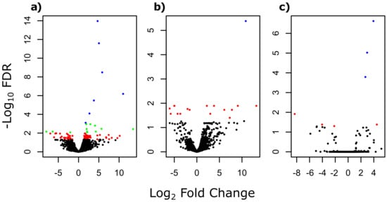 Volcano plot showing the log transformed adjusted p-values (i.e., false discovery rate, FDR) and the log fold changes for the 12,357 protein-coding genes of T. polycolpus transcriptome for: (a) the comparison between parasites infecting dace and minnow, respectively, (b) the comparison between parasites infecting dace and gudgeon, respectively, and (c) the comparison between parasites infecting minnow and gudgeon, respectively. Black dots refer to non-significant differentially expressed genes at a FDR of 5%. Red dots refer to significant differentially expressed genes at a FDR of 5%. Green dots refer to significant differentially expressed genes at a FDR of 1%, and blue dots refer to significant differentially expressed genes at a FDR of 1‰.