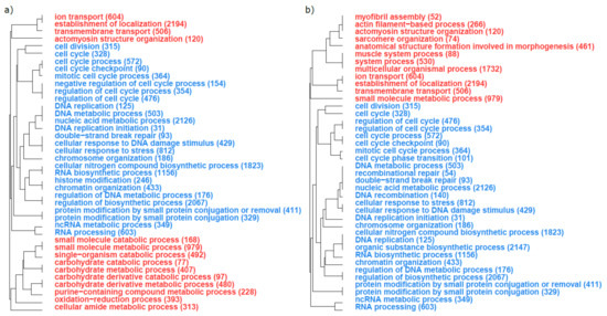 Top 40 of the gene ontologies (GOs) that were the most enriched in differentially expressed genes in the comparison between (a) parasites infecting minnow and dace and (b) parasites infecting gudgeon and dace. Blue GOs are enriched in genes that are under-expressed when comparing parasites sampled on alternative host parasites to those sampled on the principal host species. Red GOs are enriched in genes that are over-expressed when comparing parasites sampled on alternative host parasites to those sampled on the principal host species. The total number of genes involved in each GO is given in brackets.