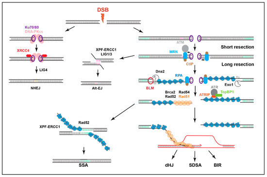 Main DSB repair mechanisms. DSBs are mainly repaired by HR (mostly in S/G2) or NHEJ. NHEJ involves no or minimal processing of the DSB. HR relies on DSB resection to form ssDNA that ‘invades’ homologous sequences on the sister chromatid or homologous chromosomes to enable DNA synthesis and repair. In mitotic cells, synthesis-dependent strand annealing (SDSA) is the most common HR pathway, although break-induced replication (BIR) also frequently occurs near telomeres. Double-Holliday junction (dHJ) repair is better characterized in meiosis. Extensively resected DSBs can also utilize the Rad51-independent pathway of single strand annealing (SSA) when repeated sequences are available, while alternative-end joining pathways (Alt-EJ), such as MMEJ, involve limited resection to expose micro-homologies.