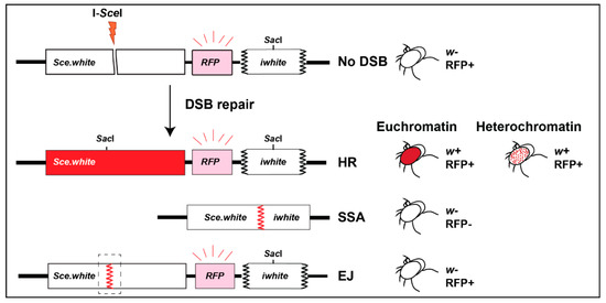 Repair cassettes have been widely used to characterize repair outcomes in response to site-specific DSBs from yeast to human cells. In flies, the LaRocque lab established the direct repeat (DR)-white repair cassette, where HR repair of a mutated white gene containing an I-SceI cut site (Sce.white), using donor sequences from a downstream truncated white gene (iwhite), results in a wild-type white sequence [72] (Figure 5). When I-SceI is expressed in the germ line, repair products can be uniquely detected in the progeny, and HR repair leads to red-eyed flies (Figure 5). Alternatively, single-strand annealing (SSA) repair (Figure 2) results in the deletion of a gene placed between iwhite and Sce.white (e.g., a red fluorescence marker, RFP), and the loss of fluorescence in white-eyed progeny [72]. When placed in heterochromatin, the cassette is partially silenced, resulting in a mosaic phenotype [33] (variegated-red eye, Figure 3 and Figure 5). End-joining (EJ) repair outcomes (reviewed in [73,74], Figure 2) can also be characterized by sequencing across the cut site of white-eyed flies [33] (Figure 5). Finally, repair outcomes can be studied in somatic cells by PCR and sequence analyses [33].