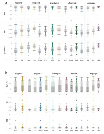 Boxplots representing diversity values of basic standard and molecular indices in five groups defined by subsistence strategy, language, and geographic region. (a) HD—haplotype diversity, ND—nucleotide diversity; pairwise—the mean number of pairwise differences; (b): Fs—Fu’s; Hri–Harpending’s raggedness index; SSD—the sum of squared deviations. Grouping label abbreviations: Region1: NA North Africa, SS Sahel/Savannah belt, Region2: ENA Eastern North Africa, ESS Eastern Sahel/Savannah belt, WNA Western North Africa, WSS Western Sahel/Savannah belt. Lifestyle1: PS Pastoralists, FM Farmers, Lifestyle2: PSS pastoralists of Sahel/Savannah belt, PNA pastoralists of North Africa, FSS farmers of Sahel/Savannah belt, FNA farmers of North Africa. Language: AA Afro-Asiatic, NC Niger-Congo, NS Nilo-Saharan. The color palette is set according to the defined groups. The line dividing boxplots into two parts represents the median of data for the variable concerned. The ends of the box indicate the upper (Q3) and lower (Q1) quartiles. The difference between quartiles 1 in light grey and 3 in grey indicates the interquartile range (IQR). The top and bottom lines show the maximum and minimum values. Dots (or other markers) beyond the extreme line indicate potential outliers.