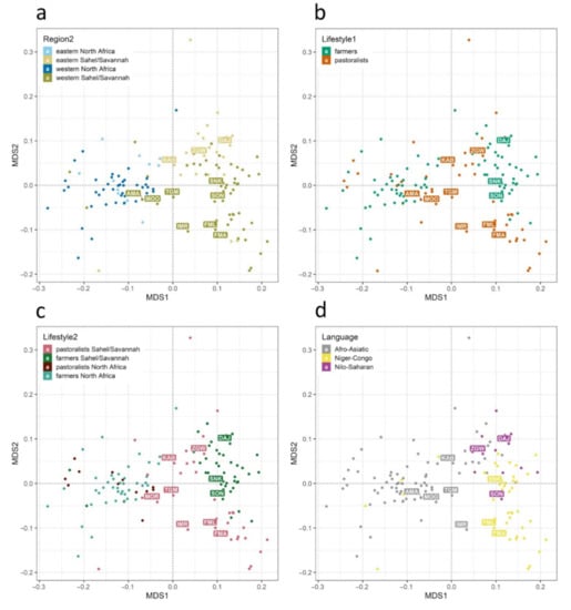 A matrix of coancestry coefficients for all analyzed populations is presented in Supplementary Table S5. MDS plots based on these values (calculated from genetic distances by −ln(1 − FST)) with a stress value of 0.112 imply differentiation of populations in a 2D scale. Four subplots show the populations colored according to geography (Figure 3a), lifestyle (Figure 3b,c), and language (Figure 3e). In general, the space covered by populations from the Sahel/Savannah belt is apparently larger than the space covered by the North African populations, which shows a higher level of differentiation (higher pairwise distances) in the southern part of this circum-Saharan area. Interestingly, the newly introduced populations collected in the Sahel/Savannah belt are distributed not only within their own genetic space: some, such as the Moors from Mauritania and Arabs from Mali, are located within the area covered by North African populations. This can best be explained by the recent immigration of these groups to the Sahel/Savannah belt. Figure 3d shows that not only geography but also language might be considered a good tool for the determination of population structure in the circum-Saharan space.