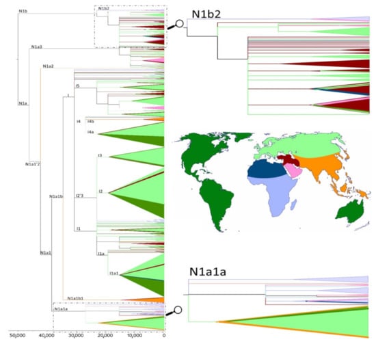 Phylogenetic reconstruction of mtDNA haplogroup N1, with time scale for the most recent common ancestors of the branches. Colors used in the tree correspond to the geographical regions illustrated in the map. Zooms of the N1a1a and N1b2 parts of the tree allow us to observe a closer relationship between the Sahel/Savannah belt and Arabian sequences.
