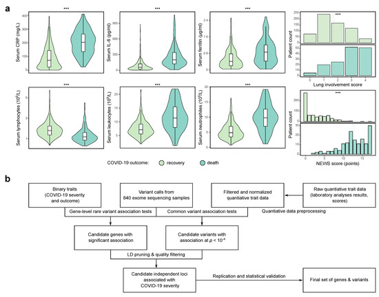 Identification of candidate genetic markers of severe COVID-19 using a deeply phenotype cohort. (a) Distributions of selected quantitative traits for individuals with different disease outcome (death or recovery) in the cohort of 840 COVID-19 patients from Russia. Shown are the distributions of the serum C-reactive protein (CRP), interleukin-6, and D-dimer levels, CT-based lung involvement score (ranging from 0 to 4), counts of lymphocytes, leukocytes, and neutrophils in the blood samples, as well as the National Early Warning Score (NEWS). All values shown correspond to maximum values recorded during the course of hospitalization. Values exceeding three standard deviations from the population mean are omitted. ***— in Wilcoxon-Mann-Whitney test (for quantitative traits) or chi-squared test (for categorical traits). (b) A schematic representation of the data analysis pipeline employed in the present study.