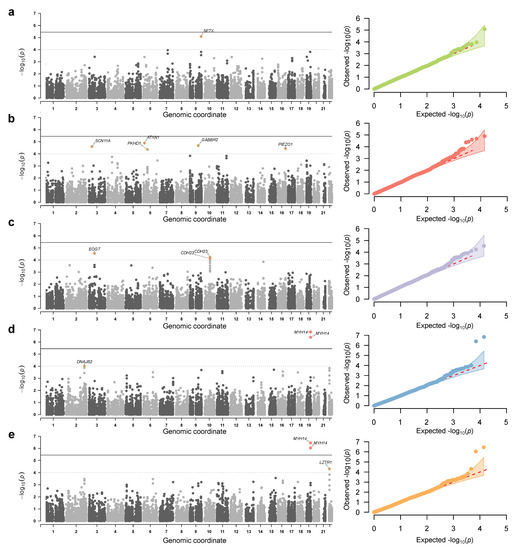 - Watanabe, K.; Taskesen, E.; van Bochoven, A.; Posthuma, D. Functional mapping and annotation of genetic associations with FUMA. Nat. Commun. 2017, 8, 1826. [Google Scholar] [CrossRef] [PubMed]