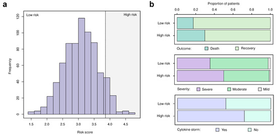 The score was computed for each patient, and then the cohort was divided into two groups corresponding to the top decile of patients with the highest risk (i.e., 10% of all patients with the highest score values) and the remaining patients in the dataset. After that, Wilcoxon-Mann–Whitney U-test and the chi-squared tests were applied to test for differences in the continuous and categorical features (individual’s death, COVID-19 severity, the presence of a cytokine storm), respectively.