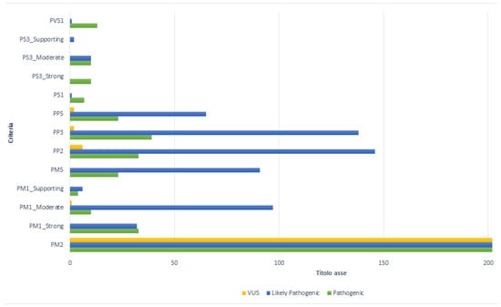 In the present study, the PM5 criterion assigned to a “novel missense change at an aminoacidic residue where a different missense change determined to be pathogenic has been seen before” [9], showed a moderate impact in 114 variants (56.4%). Of these, 91 (79.8%) were likely pathogenic, while the remaining 23 (20%) were pathogenic.