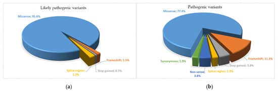 Pie chart of different variant distribution types identified: (a) likely pathogenic variants; (b) pathogenic variants.