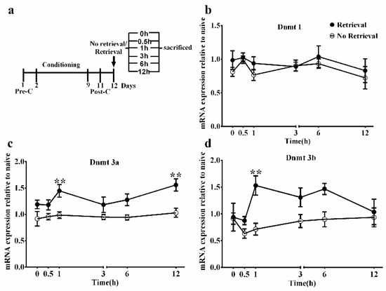 To investigate when Dnmts are upregulated during the reconsolidation phase, we performed RT-PCR to evaluate the transcription of Dnmts (Dnmt1, Dnmt3a, and Dnmt3b) in the BLA at 0 h, 0.5 h, 1 h, 3 h, 6 h, and 12 h after memory retrieval (Figure 3a, n = 8–10). For Dnmt3a and Dnmt3b, ANOVA revealed a significant main effect of retrieval condition (retrieval vs. no retrieval) (Dnmt3a: F1, 103 = 36.40, p < 0.001; Dnmt3b: F1, 97 = 13.76, p < 0.001). There was no significant main effect of test or interaction (Dnmt3a: F5, 103, test = 2.00, p = 0.08; F5, 103, interaction = 0.82, p = 0.54; Dnmt3b: F5, 97, test = 1.87, p = 0.11; F5, 97, interaction = 1.78, p = 0.12). Post hoc analyses showed that the mRNA levels of Dnmt3a were significantly increased at 1 h (p < 0.01) and 12 h (p < 0.01) after memory retrieval. Similarly, the mRNA level of Dnmt3b was significantly increased at 1 h (p < 0.01) (Figure 3c,d). In contrast, no group difference was observed in the mRNA levels of Dnmt1 (F1, 103, retrieval = 2.13, p = 0.15; F5, 103, test = 1.12, p = 0.35; F5, 103, interaction = 0.21, p = 0.96; Figure 3b). Together, these results indicate that DNMT3a and/or DNMT3b, but not DNMT1, mediates DNA methylation during memory reconsolidation, and that DNA methylation may occur at 1 h after memory retrieval.