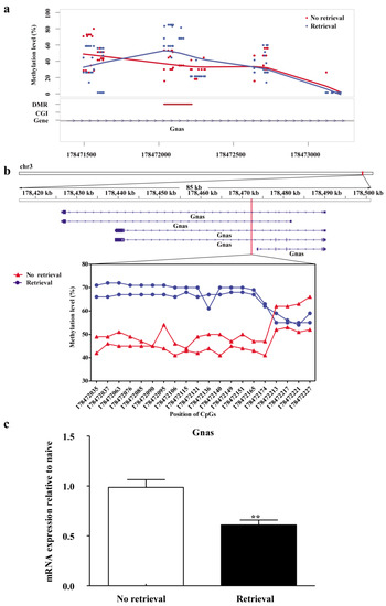 Correlation between DNA methylation and downregulation of mRNA expression at one hour after memory retrieval. (a) The DNA methylation level was evaluated by reduced-representation bisulphite sequencing. (b) The DNA methylation level was evaluated by bisulphite PCR validation. (c) Gene expression level of Gnas after memory retrieval (n = 4–5). ** p < 0.01, compared to no-retrieval group. The DNA methylation level of Sox10 and Pik3r1: see Figures S2 and S3.
