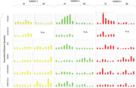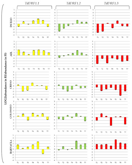 As regards the TdDRF1.3 transcript under the FI condition, all genotypes were found to be appreciably variable during the time-course with the exception of Barnacla. In particular, at T3 there was a large increase in Duilio, Altar C84, and Colosseo and, to a lesser extent, Creso, while AEL was late, showing an increase at T4. Under the RI condition, Duilio and AEL were almost constant or less than their initial values, while the other three genotypes showed variations, mainly in Creso and Colosseo and, to a minor extent, in Barnacla.