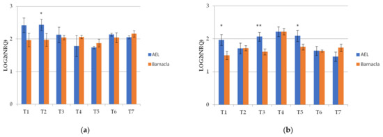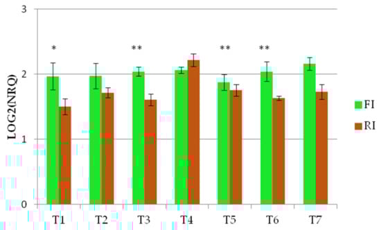 The Wdhn13 gene encodes for LEA D-11 DHN (dehydrin), which has been reported to respond to water stress in wheat plants [21,24]. The Wdhn13 gene transcript was analysed in two genotypes, AEL and Barnacla, under both irrigation conditions. Regardless of genotypes, significant differences of the Wdhn13 gene transcript were found between FI and RI conditions at T1, T2, T4, T6, and T7, as shown in Table 6. The expression profiles of the Wdhn13 gene transcript obtained analysing the environments separately in two genotypes are reported in Figure 3. Figure 3a refers to the full irrigation condition, while Figure 3b refers to the reduced irrigation condition. No significant differences were found between genotypes under FI, with the exception of T2 (p < 0.05), while significant differences were observed under RI (at T1, T3, and T5).