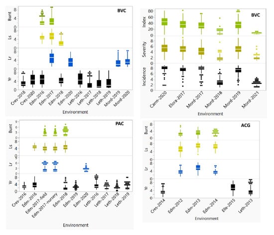 | ACG | Stripe rust | 3 | 0.38–0.50 | 0.46 | 1.0–9.0 | 3.9 | 2.0 | 1.5–7.9 | 3.85 | 1.33 | 0.62 |