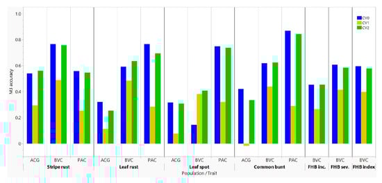 - Herter, C.P.; Ebmeyer, E.; Kollers, S.; Korzun, V.; Würschum, T.; Miedaner, T. Accuracy of within- and among-family genomic prediction for Fusarium head blight and Septoria tritici blotch in winter wheat. Theor. Appl. Genet. 2019, 132, 1121–1135. [Google Scholar] [CrossRef]