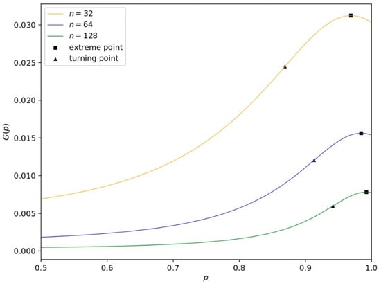 The graph of the function with respect to G derived from Equation (37) in Theorem 5. It shows the gain of a single training time as n differs. G varies with p, and the extreme points (squares) and turning points (triangles) vary with n. The turning point is approximately 8.72 × 10−9 n3 − 9.35 × 10−6n2 + 2.44 × 10−3n + 0.78, which is a good choice for the dropout rate because it balances the gain of a single time training and the representation ability of a nerual network.