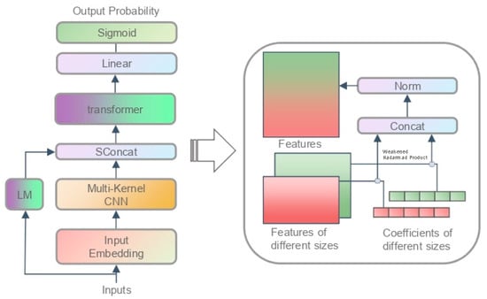 Function is the concat layer that fuses the features of the language model with the features learned from . The dimension conversion is , where is the dimension of features generated from the DNA language model. Basically, the language model was used to construct features for different sites in the sequence, and a smooth feature concat (SFC) method was proposed to fuse them with the previous features: