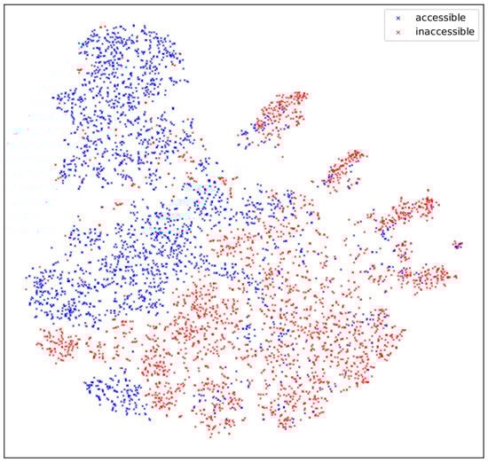 Features corresponding to the token [CLS] after the transformer for different samples. The -dimensional tensor corresponding to is reduced to a 2-dimensional value with t-SNE, and each axis represents one of them. Accessible points and inaccessible points can be roughly distinguished.