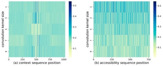 We can observe the effectiveness of SFA from another angle. Paying attention to the parameters of SFA in multi-conv, whose dimension is , where is the number of kernels, is the sequence length, and is the hidden dimension, we normalized it, and converted it to , whose dimension is . This was carried out for both the language model and the chromatin accessibility model, and they can be observed in Figure 8. Note that the sum of the vertical axis in Figure 8a,b is always due to the normalization. Obviously, different sequence positions and different convolution kernels have different weights, which proves SFA’s ability to regulate features.
