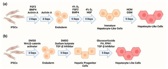 Abridged protocols for the differentiation of hepatocyte-like cells from iPSCs using (a) recombinant growth factors [,] or (b) small molecules [].