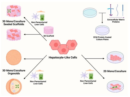 Advancements in HLC differentiation and modeling have also proven useful in studying infectious diseases such as malaria and hepatitis B. An iPSC-based model of malaria was improved by using a small molecule to induce CYP expression such that antimalarial drugs requiring CYP bioactivation could be effectively tested []. Coculture and organoid HLC models showed higher hepatitis B virus (HBV) infection efficiency than monocultured 2D methods, allowing for better propagation and study of the virus’ interaction with its host cells [,]. Providing more robust platforms for these pathogens that closely mimic their host environments in vivo is essential for understanding their pathophysiology and for seeking new treatments for the diseases they cause. Figure 2 summarizes current methods for culturing hepatocyte-like cells.
