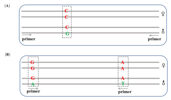 We designed two types of primers to validate the confirmed sex-linked markers. Taking XY systems as an example, the first primer was used to detect differences in SNPs between male and female individuals (defined as a single nucleotide differential sex-linked marker, SD). This needed to be shown by sequencing. The upstream and downstream primers were designed at the conserved region of sex-linked markers to ensure successful amplification in both male and female individuals (Figure 1A). The PCR products were sequenced at the Sangon Sequencing Center (Shanghai, China). After the PCR products had been sequenced, we expected to see heterozygosity in males and homozygosity in females at variable sites.