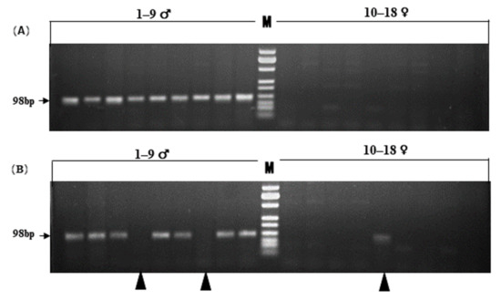 PCR validation of sex-lined loci. (A) Validation of PA sex-linked markers: 1–9♂, 10–18♀. (B) PA sex-linked marker showing sex reversal: 1–9♂, 10–18♀. Arrowheads indicate individuals with sex reversal.
