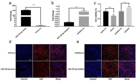 3.2. miR-152-3p Inhibits the Viability and Proliferation of MTEC1 Cells