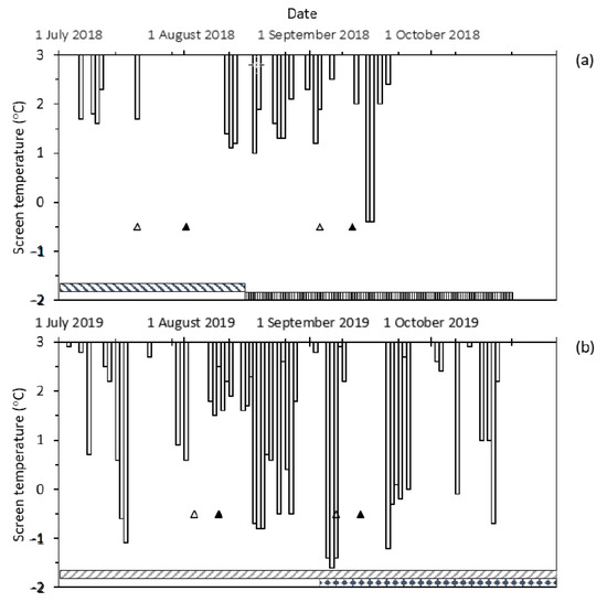 The timing of heading (Z55 open triangles) and anthesis dates (Z65 black triangles) for Wyalkatchem with frost events (screen temperatures ≤ 2 °C, 1200 mm above ground level) measured by an onsite weather station (Campbell Scientific) at Dale from July to October 2018 (a) and 2019 (b). The horizontal textured bars show the period during which the plot heaters were in place. Sowing dates for the corresponding heading and anthesis dates are: mid-April, 12 April 2018