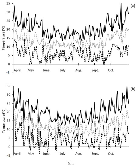 The daily march of minimum (dashed black line), maximum (solid black line) and average screen air temperature (dashed grey line) for the typical growing season in Western Australia from April to October 2018 (a) and 2019 (b) measured by an onsite weather station (Campbell Scientific) at Dale.