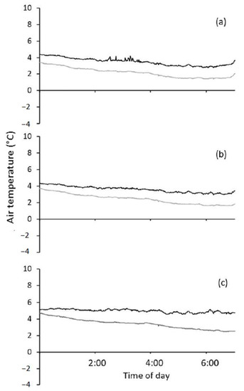 It was observed that there was a temperature differential from the origin of the plot heater manifold to the end of the manifold of ~40 °C (Supplementary Figure S3b) during a frost event on 18 August 2019 when the air temperature fell to −0.7 °C inside the screen (Figure 4). The extent of the heated area was contained within the plot (Supplementary Figure S3b). The surface temperature of some of the flag leaves is still below 0 °C (blue) in unheated areas around the edge of the plot. The non-heated plots were at −4 to −4.5 °C in the thermal image as per the outside of the plots shown there. Some flag leaves in the heated sections in Supplementary Figure S3b show surface temperatures approaching 0 °C (blue). These leaves were orientated horizontally and still had cooled dew on the adaxial surface which the rising warmer air from the heater had not warmed/evaporated. Visual leaf tissue damage occurred on horizontally orientated sections of flag leaves in non-heated plots, where cold dew pooled and presumably froze (Supplementary Figure S4a), but was not observed on these areas in heated plots. In summary, thermography demonstrated that the heater was effectively warming the plants within the plot without the heat spreading to neighbouring plots.